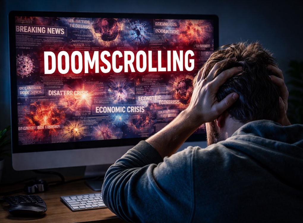 Photo by AI request: “Create an image 1020×750 pixels depicting a computer screen with “Doomscrolling” in CAPS, and a viewer holding his head in his hands in despair.”